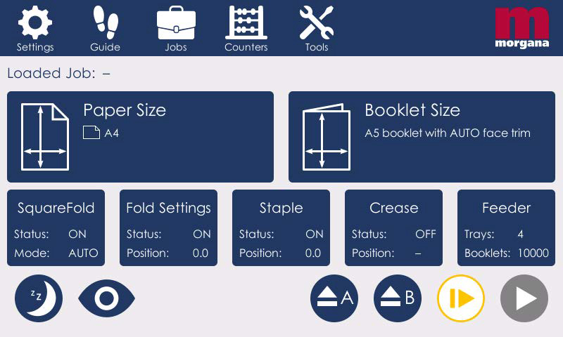 La BM4035e / BM4050e Booklet Maker Morgana  es una encuadernadora de cuadernillos profesional diseñada para entornos de impresión digital de volumen bajo a medio, capaz de producir cuadernillos de alta calidad en formatos desde A6 hasta A4 horizontal, así como formatos largos y cuadrados. Integra de forma estándar funciones de plegado, grapado central, grapado en esquina y grapado lateral, ofreciendo una gran versatilidad de aplicaciones en un solo sistema compacto. Su arquitectura permite trabajar con hojas largas, producir cuadernillos con plecado de lomo cuadrado (squarefold) y añadir módulos opcionales como corte frontal y plecado, logrando acabados profesionales con alta productividad y precisión.