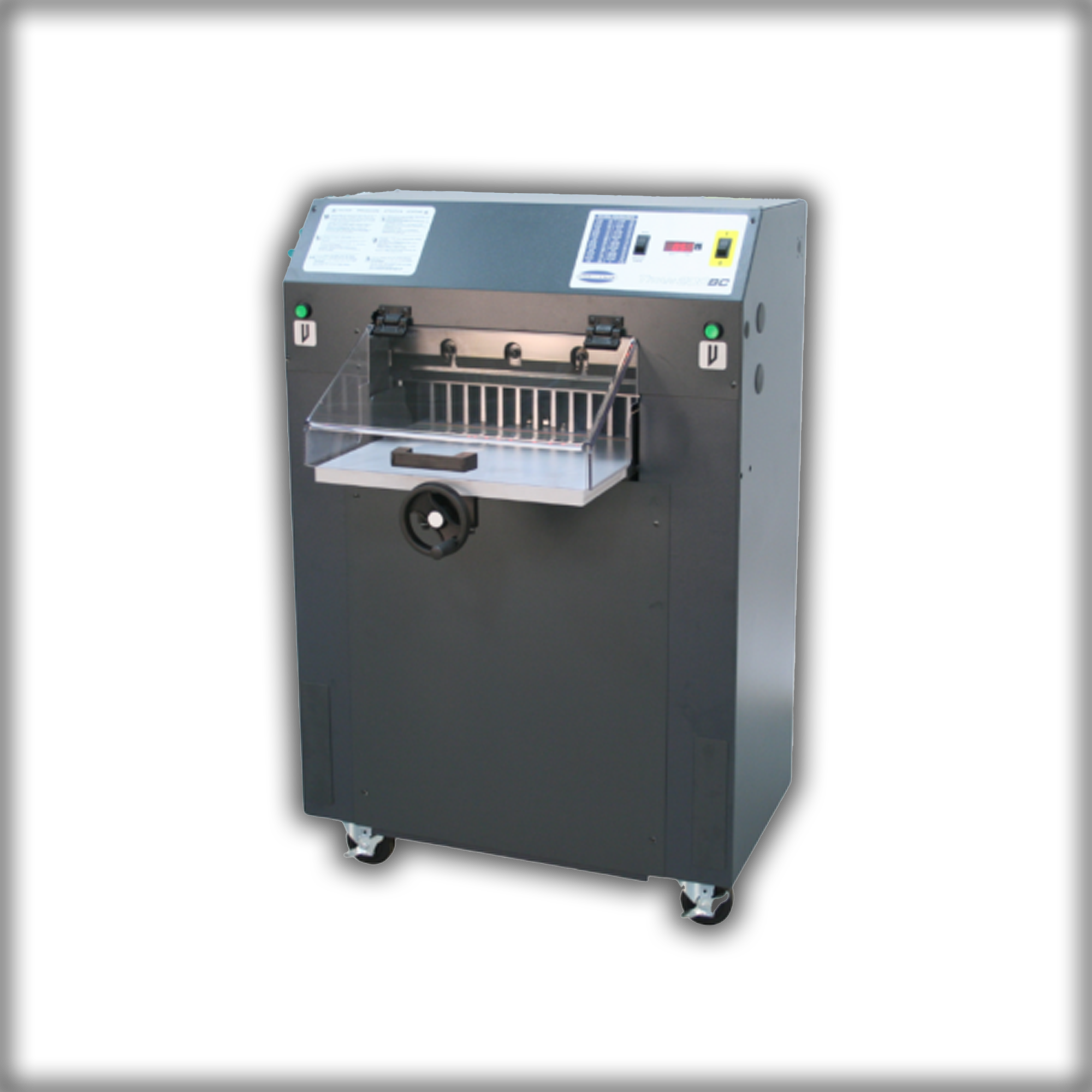 La Titan 200 BC cumple con los estándares de seguridad más estrictos de la industria en la actualidad. Está equipada con una cubierta de seguridad en la mesa frontal (o cortinas de seguridad opcionales), una mesa trasera cerrada, botones de corte de dos manos y un pestillo de seguridad para el cuchillo, lo que contribuye a nuestras certificaciones UL y CE.